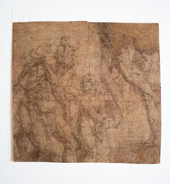 - NOTIZIE STORICO CRITICHE L' episodio è descritto nel secondo libro dell'Eneide di Virgilio "Detto così, distendo sulle larghe spalle e sul collo reclino una coperta, la pelle d'un fulvo leone, e mi sottopongo al peso; alla destra mi si stringe il piccolo Iulo, e segue il padre con passi ineguali" (Eneide II 721-724). \nIl disegno, di buona fattura, è una copia da "L' incendio di Borgo" un affresco (circa 670x500 cm) di Raffaello e aiuti, databile al 1514 situato in una delle Stanze Vaticane. Gli impegni di Raffaello resero sempre più necessaria la presenza degli aiuti tra cui spiccavano Giulio Romano, Giovan Francesco Penni e Giovanni da Udine.