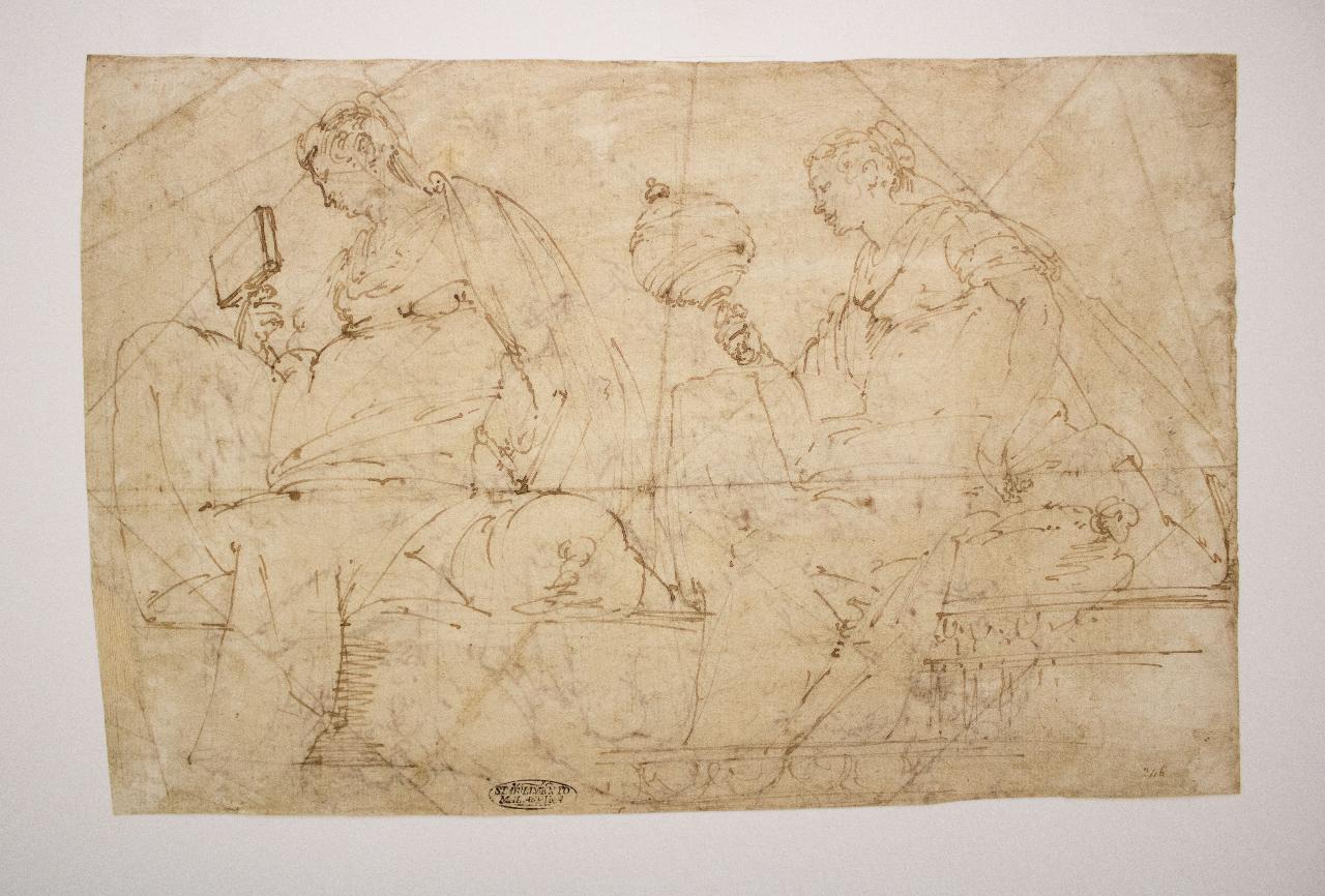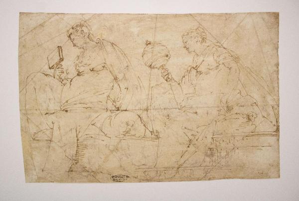 Il foglio presenta disegni sia al recto che al verso. Sul recto ritrae a penna in stato di bozzetto due figure femminili, probabilmente delle allegorie e sul verso quattro figure maschili, probabilmente gli evangelisti.