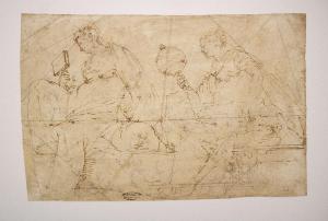- NOTIZIE STORICO CRITICHE Il foglio era stato precedentemente attribuito da Malaspina a Luca Cambiaso e solo in tempi più recenti attribuito a Giulio Benso, probabilmente trattasi di opera giovanile. \nFondamentale per l'attribuzione è stata la scoperta del disegno sul verso, riportato alla luce dopo il restauro negli anni Settanta (sino ad allora il disegno è stato nascosto da un cartone di controfondo). Il disegno è tratto da un prototipo cambiasesco andato probabilmente perduto di cui sono note però altre repliche (Monaco, Graphische Sammiung, inv. n. 21053; Gabinetto dei Disegni e delle Stampe degli Uffizi 95273; New York, Metropolitan Museum, Collezione Lehman, inv. n. 1975.I. 288, Milano, Civiche Raccolte d'Arte del Castello Sforzesco, Gabinetto Disegni e Stampe, collezione Morelli, inv. n. 6626 [C 896]). (Tordella, 2000, p.419)\nIl foglio pavese presenta secondo Tordella diverse corrispondenze stilistiche stringenti con disegni del Benso, in particolare la studiosa cita le due diverse versioni di una Visitazione custodite al Museo del Louvre (inv. 9211) e l'Elevazione della croce della collezione Feitelson posta in relazione al Cambiaso da Mary Newcom, in cui inequivocabile appare la corrispondenza di mano con I quattro evangelisti al verso del foglio Malaspina.\nInteressanti appaiono inoltre i confronti con i fogli del Gabinetto dei Disegni e delle Stampe degli Uffizi 4240 S raffiguranti San Cristoforo con i santi Dionigi e Giorgio e altre figure e il Sacrificio di Abramo 5778 S. In particolare quest'ultimo è stato letto come libera interpretazione di Benso dell'affresco cambiassero oggi distrutto ma un tempo presente nel salone della Curia del palazzo vescovile di Genova databile al 1579 ca. collegato pertanto al periodo in cui Benso fu allievo nella bottega del Paggi. Ciò risulta importante poichè quest'ultimo richiedeva ai suoi allievi di copiare gli schizzi, i dipinti e i rilievi degli artisti più affermati. Il Benso è possibile che abbia copiato direttamente dall'affresco e non sarebbe l'unico caso esistente, si citano infatti anche due Adorazioni una della Staatsgalerie di Stuttgart e una del Gabinetto dei Disegni e delle Stampe degli Uffizi (inv. 7159 S) (Tordella 2000, p. 420)\nSecondo Lucia Collobi Ragghianti il foglio è invece da ricondurre alla mano di Andrea Semino o alla scuola del Cambiaso, secondo la studiosa il recto raffigurerebbe le arti liberali.