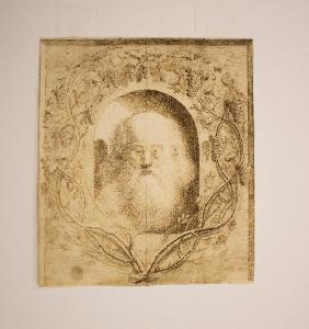 All'interno di una nicchia centinata si delinea il ritratto di un anziano dalla fronte calva e dalla lunga e folta barba. il ritratto è circondato da una corona di viti intrecciate e grappoli d'uva.