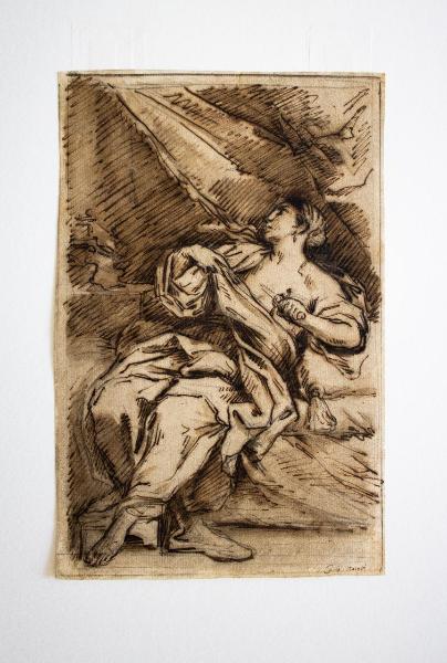 - NOTIZIE STORICO CRITICHE \nLo stile riporta all'ambiente romano, in particolare a quello di Carlo Maratti o della sua cerchia. Un' antica iscrizione presente al recto in basso a destra sembrerebbe confermare tale ipotesi; sostenuta soprattutto dagli elementi formali presenti nel disegno. I panneggi dalle ricche volumetrie ma dai risvolti più controllati evidenziano il superamento dello stile barocco in favore di un linguaggio dalle forme chiare senza rinunciare alla complessità delle stesse. Infine il volto di Lucrezia, eroina romana che preferì il suicidio ad una vita di vergogna, denota una certa familiarità con i modi propri del Maratti. Vista l'insistenza del segno in alcuni punti ed alcune debolezze nel delineare le mani potrebbe trattarsi di un copista dell'epoca o poco successivo.