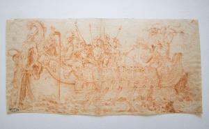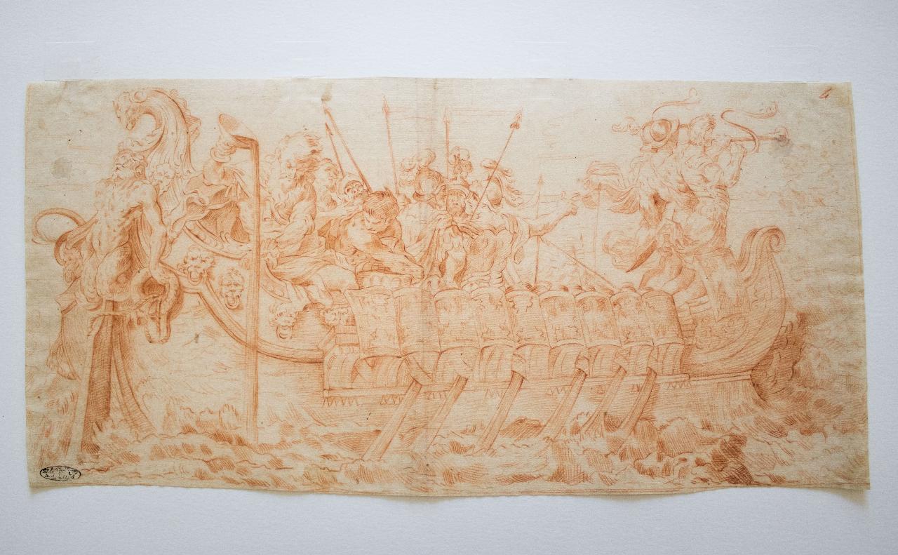 A bordo di una nave un gruppo di soldati raccolti al centro è intento a osservare e indicare tre compagni disposti a prua nell'atto di dar fiato a delle trombe. Sulla destra, ovvero vicino a poppa, una figura ammantata con un calice in mano è intenta a versarne il contenuto direttamente in mare. Al suo fianco un giovane tiene tra le braccia un grosso otre. La nave è riccamente decorata. A poppa la polena ha la foggia di un tritone sormontato da un motivo decorativo terminante con la testa di un caprone. Sul lato visibile del veliero vi sono diversi mascheroni e scudi, sotti i quali spuntano i remi che sono in buona parte immersi in acqua.