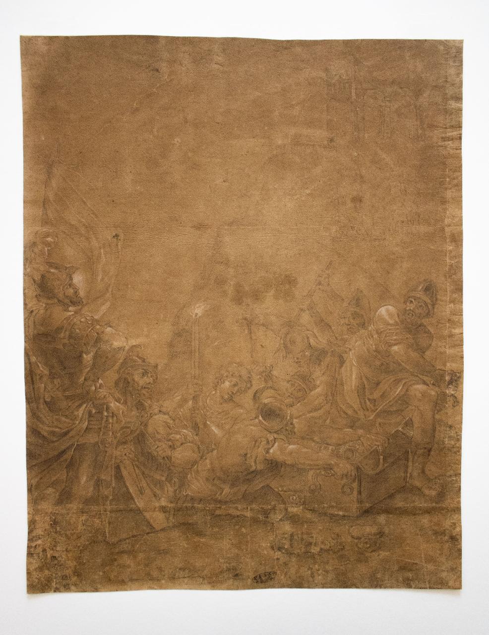 L'opera è delineata per lo più sulla metà inferiore del foglio. Dove si scorge un gruppo di otto soldati. All'estrema sinistra uno di loro sorregge uno stendardo e volge lo sguardo verso un punto non ben definito verso l'alto. Appena sotto di lui un compagno intento a suonare un tamburino osserva un collega che sembra abbia appena rinvenuto un forvierò colmo di ricchezza. Dietro a questo un altro personaggio illumina la scena con una torcia. Sulla parte destra della composizione altri quattro soldati con le armi sfoderate sono intenti invece a combattere. Nella parte superiore del foglio verso destra si scorgono delle architetture non ben definite.