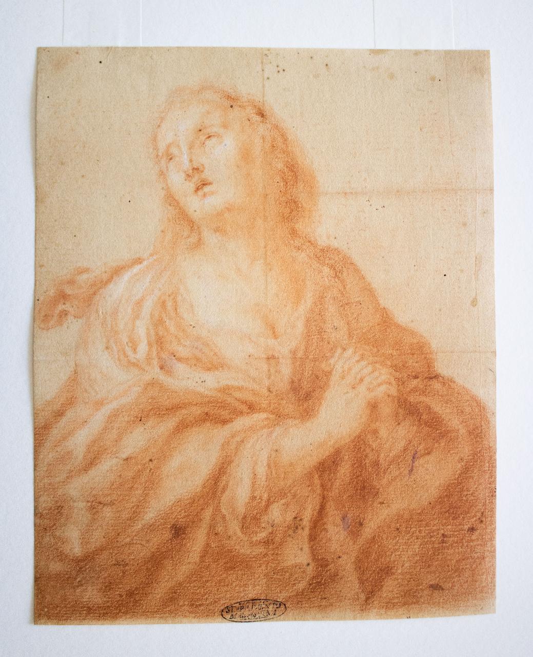 - NOTIZIE STORICO CRITICHE \nOriunda di Magdala, Comunemente nominata Maddalena, incontrò per la prima volta Gesù quando fu da lui liberata da una possessione demoniaca (Marco 16,9). Da quel momento lo seguì con fedeltà, grata della liberazione ricevuta. Fu presente alla crocifissione del Signore e per prima lo vide risorto. Fu lei infatti che avvertì del sepolcro vuoto i discepoli. Non è da confondere con la peccatrice, che unge d'unguento i piedi di Gesù, nella casa del Fariseo (Luca 7,36-38) di cui sono ignoti il nome e qualsiasi altro particolare della vita. Festa il 22 luglio.\n\nIl disegno, dalle qualità appena accettabili, potrebbe appartenere ad un artista operante verso la fine del XVII secolo in area lombarda. Il tratto incerto e la timidezza nella stesura chiaroscurali farebbe pensare ad una copia da un dipinto non ancora individuato.