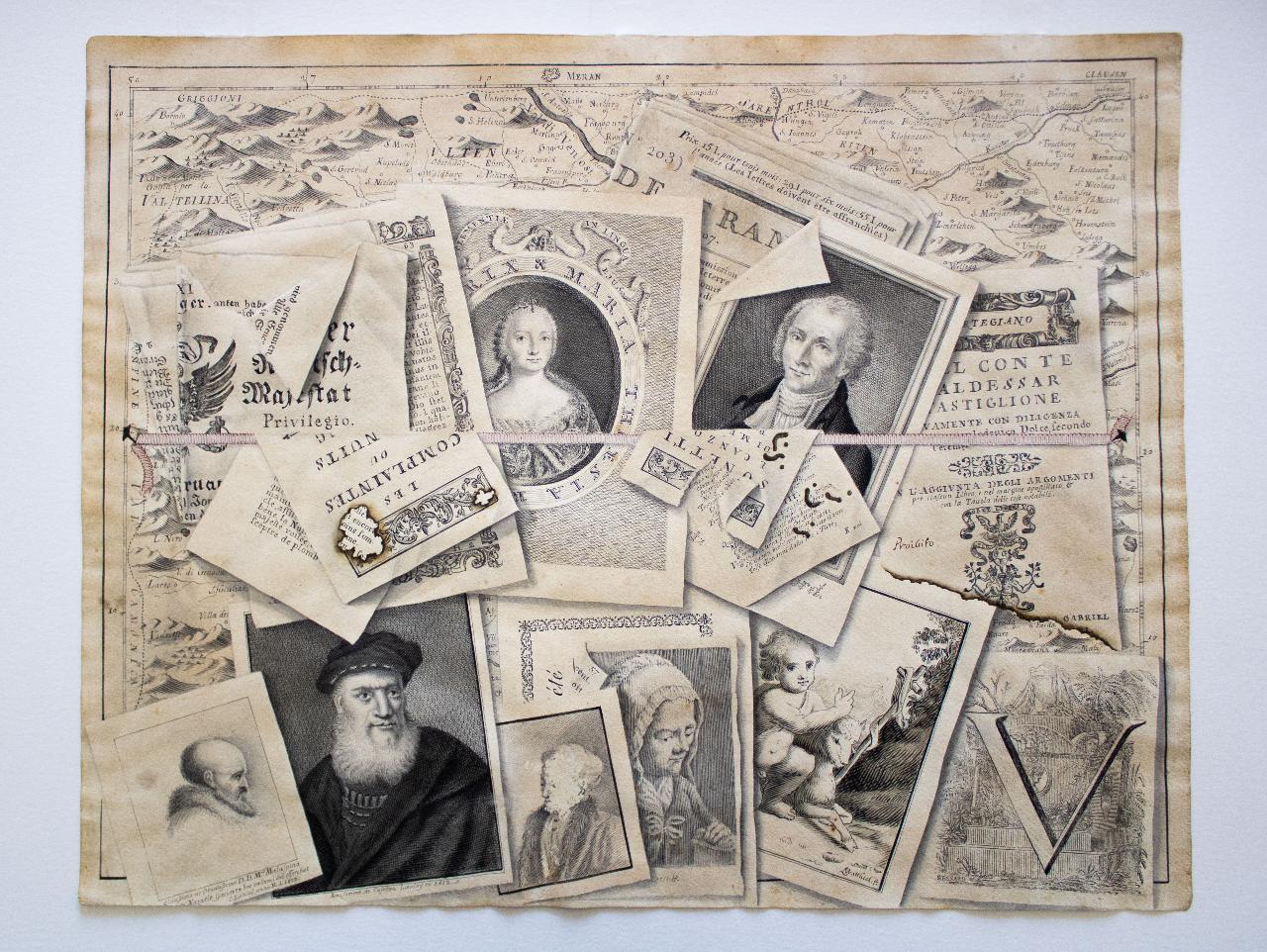 - NOTIZIE STORICO CRITICHE \nIl complesso disegno una volta sottoposto ad un attento esame dimostra più la pazienza dell'autore che non una particolare brillantezza nell'esecuzione. Nonostante ciò si deve apprezzare il sorprendente effetto a "tromp l'oeil" che mira a suscitare nello spettatore stupore e divertimento. Ed è infatti questo ultimo sostantivo ad essere stato scelto dall'autore come titolo di questa bizzarra opera, che si inserisce in un filone che affonda le sue origini nel concetto di illusione ottica nell'arte, quindi in tempi antichissimi, ma che considerato nella sua accezione iperrealista legata all'illusione ottica scaturita da composizioni di piccoli oggetti vede la sua diffusione a partire dal XVI secolo.\nLa firma dell'autore non ha momentaneamente permesso di individuarne l'identità, facendo propendere per un amatore il cui operato resta probabilmente a tutt'oggi ancora sconosciuto. La complessa e intricata composizione rimanda all'impero austro ungarico ed al regno di Maria Teresa d'Austria (Vienna 1717 - ivi 1780), presente nella composizione con un ritratto; oltre alla raffigurazione di una stampa lacera dove si scorge il particolare dello stemma della sua casata e una cartina della zona del nord est della penisola italica. Vi sono inoltre raffigurate stampe di carattere religioso, ritratti, proclami, una capolettera "V", un ritratto di un avo della famiglia Malaspina ed il frontespizio del famoso "Libro del Cortegiano" di Baldassarre Castiglione (Casatico 1478 ? Toledo 1529) dove compare un'eloquente nota a penna: "Proibito". La composizione non è quindi un semplice "divertimento", ma una complessissima serie di rimandi e simbologie legate eventualmente al pensiero socioculturale e politico del suo autore.