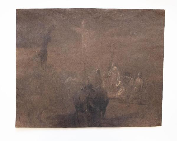 - NOTIZIE STORICO CRITICHE \nIl disegno è attribuito a Pasquale Massacra (Pavia 1819 - Pavia 1849.) Pittore noto per i suoi quadri storici, di tema prevalentemente pavese, fu allievo di C. Ferrari presso la scuola di disegno, nudo e incisione istituita dal Comune di Pavia in palazzo Malaspina. Tra le sue opere più importanti si ricordano "La madre di Riccardo Langosco cerca il cadavere del figlio", "Frate Bussolari". Entrambe conservate al museo civico pavese, che conserva anche molti bozzetti del nostro. Fervente patriota, cadde nella guerra contro l'Austria colpito da un fucilata.\nLa drammatica scena mostra l'abilità del Massacra nella sintetica ed efficace gestione della spazialità attraverso l'uso del chiaroscuro. I punti di ombra e luci sono sapientemente scelti in modo da rendere la profondità spaziale ed invitare l'occhio dello spettatore a concentrasi sui personaggi principali della scena.\nUna ricognizione più approfondita tra le opere dell'autore potrebbe fare emergere un dipinto di medesimo soggetto per cui tale bozzetto potrebbe risultare preparatorio.\n