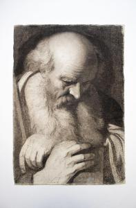 Una testa col capo chino di anziano dalla folta barba appoggia mano ed avambraccio su un tomo. Si scorgono le pesanti vesti e un bastone. Lo sfondo reso con un fitto e scuro tratteggio.
