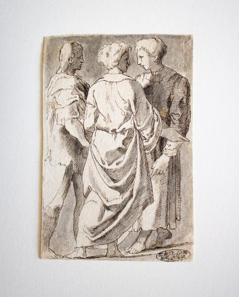 RECTO: Tre personaggi maschili stanti ripresi a piena figura con indosso lunghe vesti panneggiate sono coinvolti in una conversazione. La figura centrale è posta di schiena e le altre due di profilo.\nVERSO: sono presenti alcune linee per una costruzione prospettica