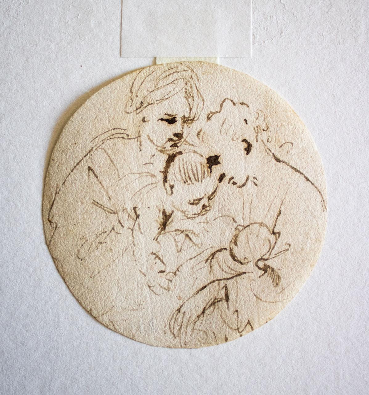 - NOTIZIE STORICO CRITICHE \nIl gruppo rappresenta le tre generazioni della discendenza di Cristo. Sant'Anna è difatti la madre della Vergine e la nonna di Gesù. Il San Giovannino può essere messo invece in relazione con l'agnello di Dio, in compagnia del quale viene sovente rappresentato. La sua presenza quindi prefigurerebbe il Sacrificio di Cristo per la salvezza dell'umanità.\n\nIl disegno dal segno libero e veloce può essere ricondotto allo stile della scuola bolognese della seconda metà del XVI secolo. Per le fisionomie dei due volti femminili e la sintesi impiegata in particola modo nel delineamento del volto scorciato di San Giovannino rimandiamo un confronto di semplice riferimento alle prove grafiche della tarda attività di Annibale Carracci (Bologna 1560 - Roma 1609).