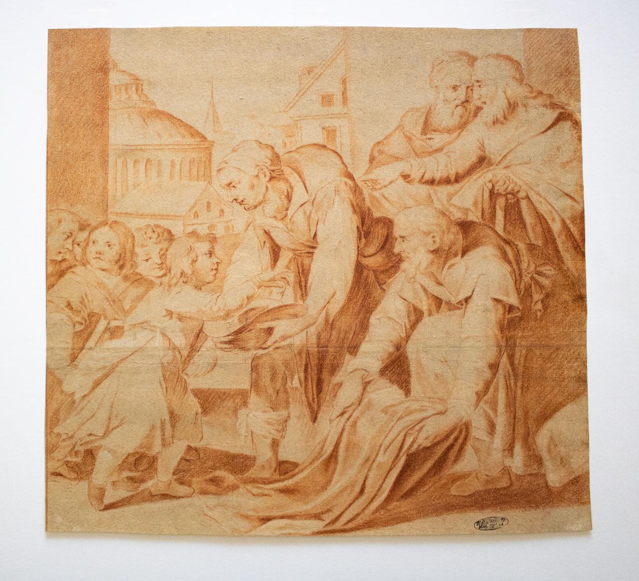 Figure di mendicanti sullo sfondo di una città. Gruppo di figure