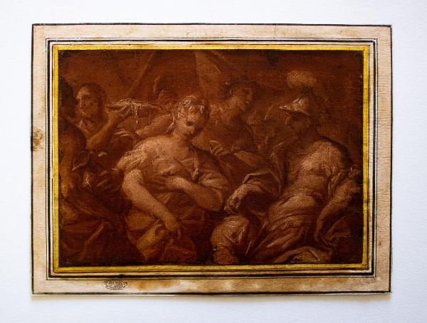 La composizione ritrae a mezza figura due personaggi, uno maschile ed uno femminile, che dialogano tra loro. I due sono immersi in un'atmosfera festosa e sono circondati da servi e astanti che recano brocche e vassoi con gioielli.