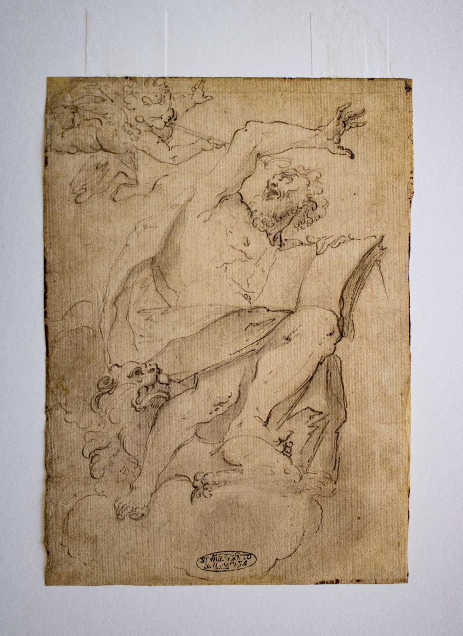 Una figura di vecchio barbuto , con ai piedi un leone ed in mano un libro, è colta di sorpresa da un angioletto che suona una tromba posto in alto a sinistra.
