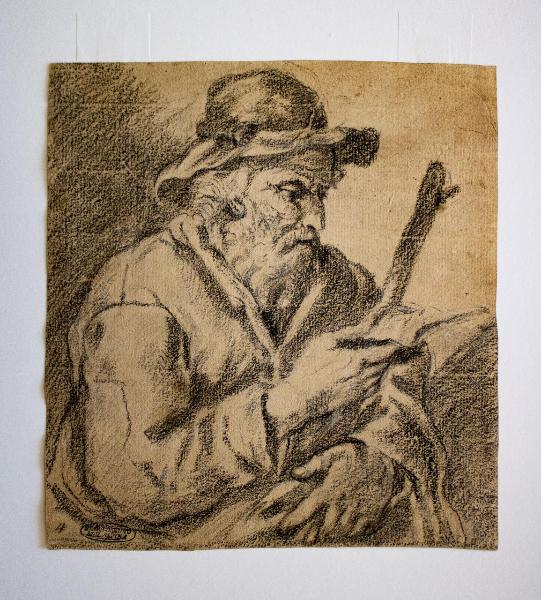 Una figura a mezzo busto di mendicante rivolto verso destra intenta a leggere un cartiglio.