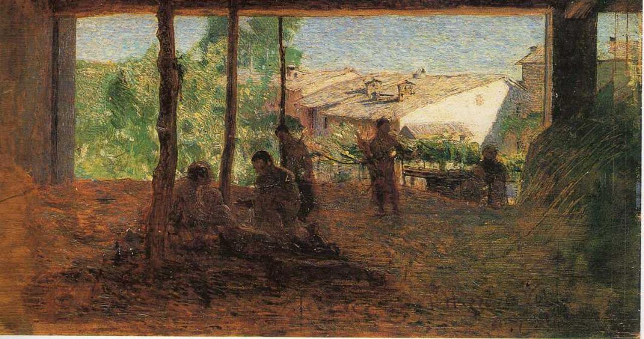 - NOTIZIE STORICO CRITICHE Le fasi di elaborazione della tele definitiva sono illustrate dal pittore stesso in una lunga riflessione scritta il giorno dopo la composizione del bozzetto, il 5 luglio 1892. Le forme sono costruite con picchiettature di colore e accostamenti di tonalità più o meno rialzate della stessa tinta, a rendere la luce del sole che si riverbera sulle case e sulle fronde degli alberi. Il tema scelto vede protagonista un povero vecchio senza famiglia e senza casa che si è ridotto a finire i suoi giorni su un fienile, dove la pietà di alcune persone lo consola per l'ultima volta. L'elaborazione del pittore, condotta sul doppio registro tecnico e contenutistico, rivela l'attitudine a procedere secondo un iter tradizionale, ma anche a tenere presente la necessità dell'impegno e del pensiero, che sta alla base del fare artistico.