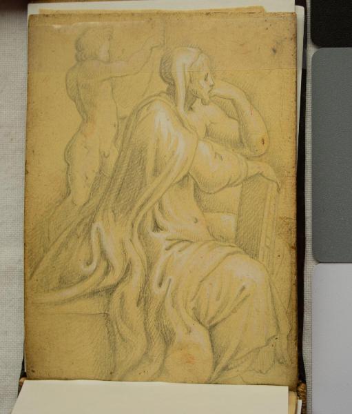 Figura maschile seduta in contemplazione accompagnata da putto.