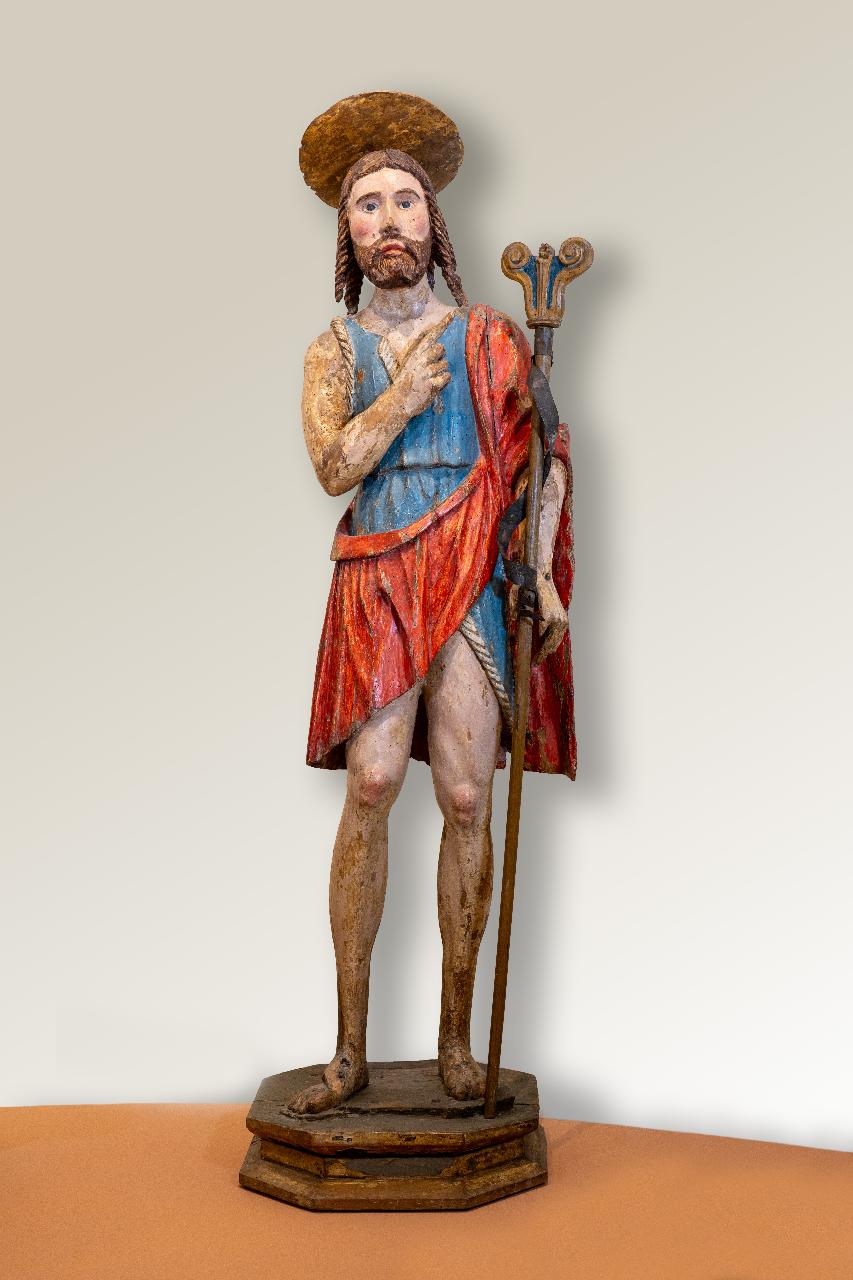 La statua raffigura San Giovanni Battista stante con le gambe leggermente divaricate. Il braccio sinistro è disteso e la mano impugna un bastone che termina in alto con motivo a volute. Sul bastone è inchiodato un cartiglio metallico sul quale doveva apparire l'iscrizione propria dell'iconografia del santo "Ecce agnus Dei [...]". Il braccio destro è piegato in corrispondenza del petto e l'indice addita verso l'alto. Il Battista indossa una veste corta azzurra con scollo a "V" e i bordi foderati di pelliccia, sormontata da un mantello rosso che dalla spalla sinistra ricade da una parte lungo il braccio sinistro e dall'altra lungo la coscia destra. Il viso è incorniciato dalla barba e dalla capigliatura che riproduce riccioli ad anello. Entrambi i piedi sono fissati a un basamento ottagonale.