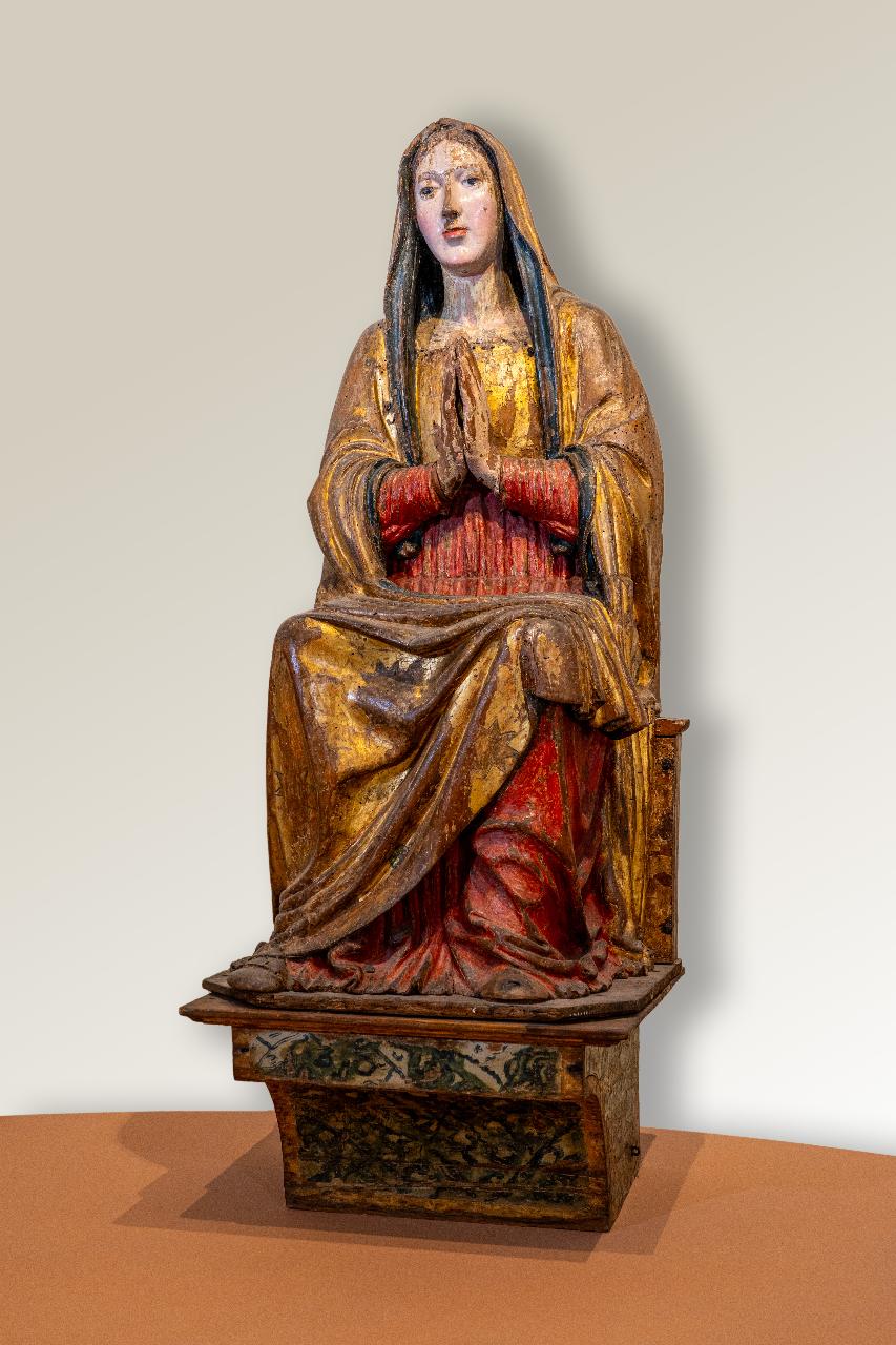 La Madonna è seduta su un trono privo di schienale con le mani giunte. Indossa una veste rossa cinta in vita, caratterizzata da un fitto panneggio in corrispondenza del ventre e delle maniche strette al polso. L’intera figura è ricoperta con un manto dorato all’esterno e doppiato internamente in azzurro che ricopre le gambe creando una serie di pieghe volumetriche. Particolarmente raffinato è il dettaglio del manto ripiegato sotto entrambi gli avambracci. Il volto ovale è solcato dal naso tracciato con tagli netti e sottili e occhi tondeggianti sotto pesanti palpebre. La profondità della seduta potrebbe suggerire che in grembo alla Madonna fosse posto un Gesù Bambino.