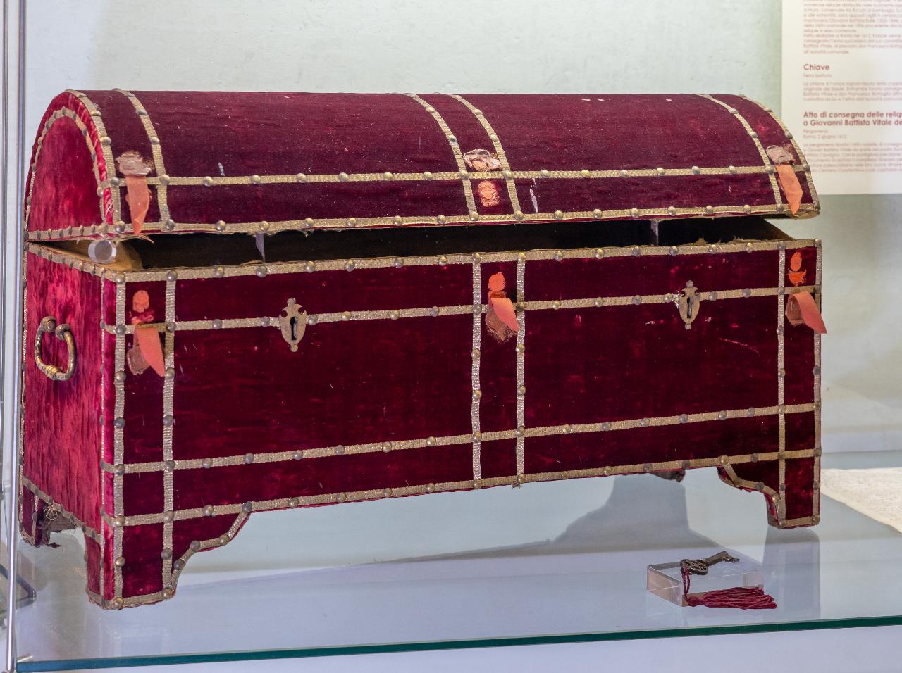 Il bauletto presenta un coperchio semicilindrico, piedi scolpiti a mensola, due maniglie laterali e due serrature con bocchette a scudo. È di legno completamente rivestito di velluto cremisi, profilato da strisce verticali e orizzontali di passamaneria di fili metallici dorati fissati a distanze regolari da borchie dorate. Internamente è foderato di seta gialla fissata lungo il perimetro con borchie e impreziosita, nel coperchio, con losanghe di fettucce di seta rosa. Sulla fronte, al centro e alle estremità, sono appesi i sigilli in ceralacca uniti con fettucce rosse del vescovo mantovano Giovanni Battista Bellé (1835-1844) che durante la visita pastorale del 1836 procedette alla ricognizione delle reliquie in esso contenute. Il manufatto ha la struttura degli scrigni cinquecenteschi dai quali si differenzia per la decorazione in listelli di filati metallici sottili e piatti in luogo delle vistose lamine metalliche sbalzate maggiormente in uso nel Cinquecento. Nel baule erano conservate, tra fiocchi e bambagia, numerose reliquie distribuite in 24 scatolette lignee con relativa documentazione.
