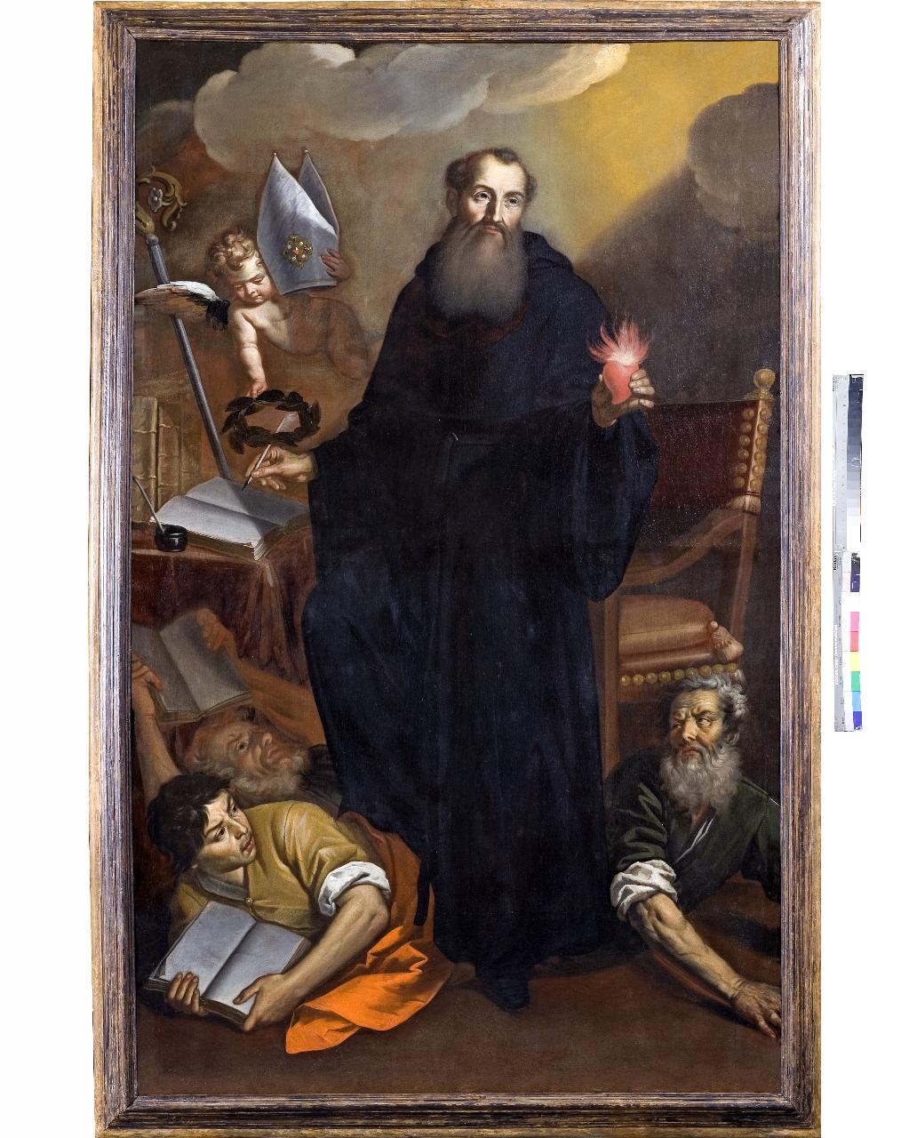 - NOTIZIE STORICO CRITICHE Fino al trasferimento negli spazi museali nel 2017, la tela era depositata nel solaio della prepositurale di Sant’Erasmo e ad oggi non ne è nota la provenienza. La raffigurazione ha una grande forza persuasiva e simbolica con Agostino abbigliato con il saio nero dei frati agostiniani e lo sguardo rivolto verso l’osservatore, mentre si erge sopra tre uomini caduti ai suoi piedi che rappresentano gli eretici. Nella mano sinistra tiene il Cuore fiammato simbolo del suo fervore religioso mentre con la destra scrive su un libro aperto, segno della sua volontà di dischiudere al popolo la verità delle Sacre Scritture. Il soggetto è strettamente legato alla storia di Castel Goffredo della metà del XVI secolo. È infatti datata al 1550 una lettera indirizzata dal cardinale Ercole Gonzaga al fratello Ferrante, governatore di Milano, in cui si legge “Castelgifredo è fatto quasi tutto luterano” (la lettera è conservata presso l’Archivio di Stato di Mantova). È noto che in seguito ai fermenti riformistici che interessano la Cristianità già dal XV secolo, nel 1517, il frate agostiniano Martin Lutero diede voce allo scandalo legato alla vendita delle indulgenze dopo aver compiuto un viaggio a Roma. Secondo alcuni storici durante il percorso si fermò presso il convento agostiniano dell’Annunciata, sul confine tra Castel Goffredo e Medole, all’epoca punto di riferimento della comunità. La raffigurazione rimanderebbe quindi al ritorno della comunità nell’ambito dell’ortodossia cattolica. Stilisticamente il dipinto è ascrivibile all’ambito mantovano e databile al quarto decennio dei XVII secolo. Particolarmente significativo risulta il confronto con la tela dedicata al medesimo soggetto attribuita a Giovanni Lanfranco e databile al 1636-39 conservata nella cappella di Sant’Agostino della chiesa omonima a Roma (rione Campo Marzio).\n\n