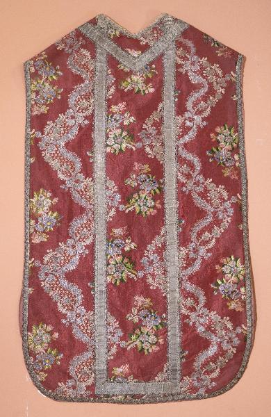 Pianeta confezionata in taffetà operato in cui la trama di fondo interviene anche per slegature (effetto liseré) e l’opera è realizzata per effetto di numerose trame broccate che intervengono per slegature secondo il disegno. Le trame broccate sono in seta di diversi colori e in argento lamellare e filato su anima di seta bianca. La decorazione è riferibile al motivo “a meandro” che vede la presenza di due tralci nell’altezza della pezza. Il meandro vero e proprio è realizzato da un nastro caratterizzato da una doppia profilatura: una argentea profilata da piccoli fiori a quattro petali e l’altra da fiori di piccole dimensioni alternati a foglie simili a piume. All’interno si ripetono con andamento sfalsato piccole bacche rosate. Lo sviluppo sinuoso del meandro viene ripetutamente interrotto da bouquets descritti dalle trame broccate policrome e metalliche che riempiono le profonde anse create dallo svolgersi del nastro. Il gallone è lavorato a fuselli in argento filato su seta e argento lamellare.