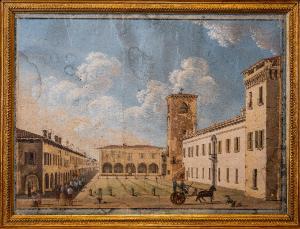 - NOTIZIE STORICO CRITICHE La veduta ritrae l’aspetto della piazza e degli edifici che vi si affacciano come apparivano nella seconda metà del XVIII secolo. Si tratta di un documento iconografico interessante dal punto di vista storico perché risultano evidenti i cambiamenti che nei secoli hanno interessato la maggior parte degli edifici raffigurati. Sul lato orientale dei portici è scomparso l’argano utilizzato per movimentare il secchio che attingeva l’acqua dal pozzo sottostante, sostituito nel XIX secolo da una fontana, e sulla facciata del municipio, al centro, non esiste più la recinzione che chiudeva gli archi verso la piazza. La Torre di Castelvecchio presenta la maggior parte delle modifiche rispetto ad oggi: la copertura rivestita di tegole è stata sostituita nel 1925 con merli ghibellini in muratura, la finestra a piano terra che si affaccia sulla piazza ha lasciato il posto ad un arco passante, non esistono più né la scala esterna in muratura posta tra la Torre e palazzo Gonzaga Acerbi né la ringhiera posta sul lato est della torre. La piazza, delimitata a est e a ovest da paracarri che cingono un prato erboso (?) presenta oggi una pavimentazione diversa. L’analisi dei dettagli sopra descritti e, più in generale il soggetto specifico, giustificano la datazione proposta e l’attribuzione a un esecutore locale.