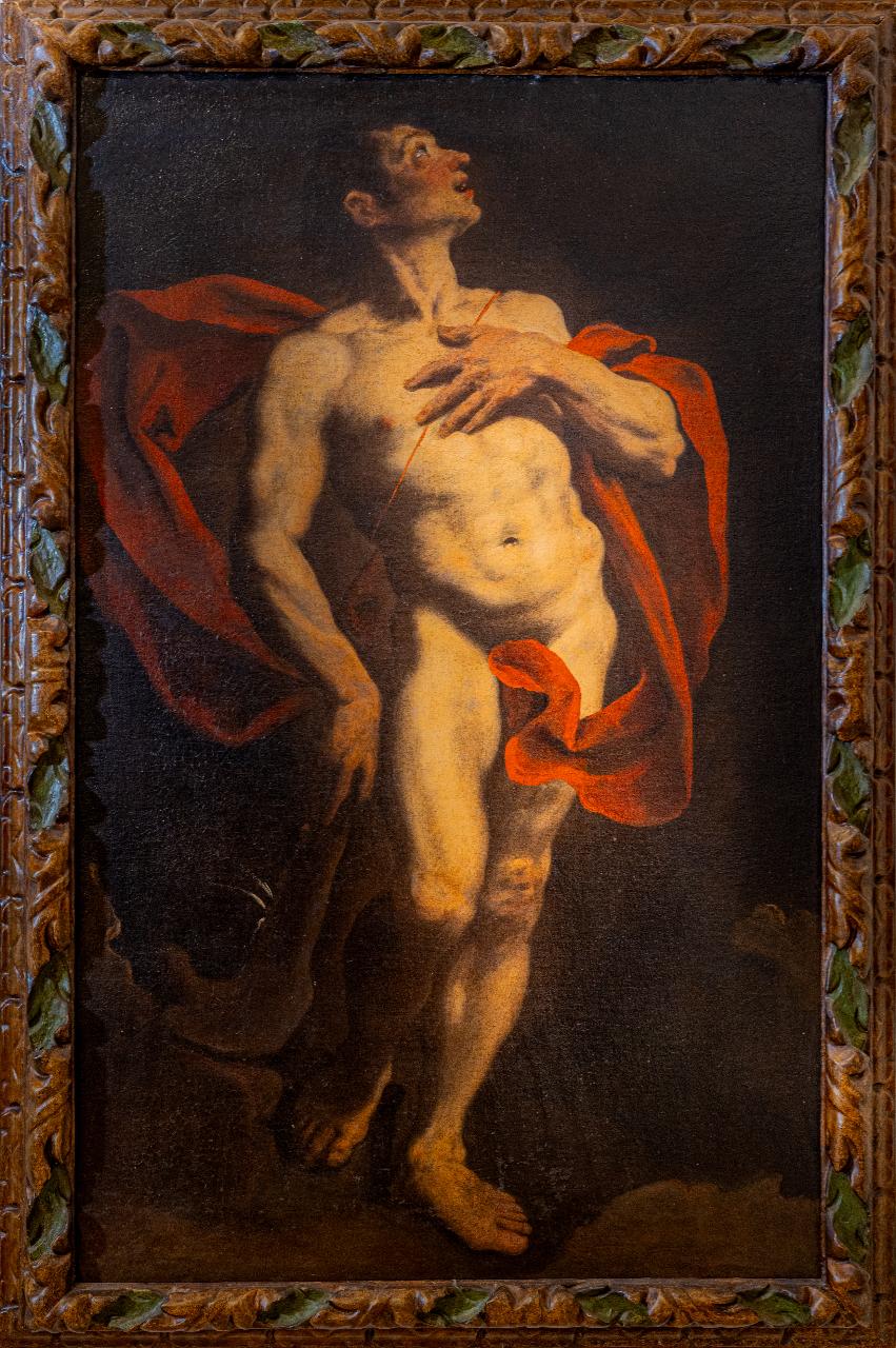 - NOTIZIE STORICO CRITICHE Fino al suo trasferimento in museo, il dipinto era conservato nella sagrestia nuova della chiesa prepositurale di Sant’Erasmo v.m. a Castel Goffredo e per ora non è stato possibile risalire alla sua ubicazione originale. È certo però che la tela sia nata in pendant con quella raffigurante san Giovanni Battista, con cui condivide la provenienza e il trasferimento in museo. Malgrado l’apparenza profana, suggerita dall’espressione da avventuriero fanfarone dotato di grande forza fisica e dalla posa del braccio destro mollemente ripiegato con la mano sul cuore, sembra sicura un’originaria destinazione chiesastica dell’opera, con una simbologia che forse legava le due tele a una figura, perduta, di Cristo. L’attenta regia luministica, la precisa definizione muscolare della figura che emerge da un fondo crepuscolare, il volto marcatamente caratterizzato, definiti da pennellate larghe e brillanti suggeriscono l’attribuzione al pittore veneziano Pietro Della Vecchia. L’ubicazione così periferica dei dipinti rispetto a Mantova, centro del Ducato dei Gonzaga, è forse spiegabile con la prossimità di altre opere del pittore in territorio bresciano dove infatti nella chiesa parrocchiale di Borgosatollo è conservata una piccola pala con i “Santi Agostino, Monica e Barnaba”.