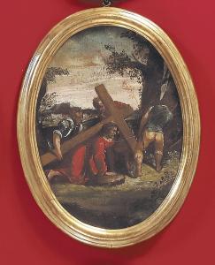 Personaggi: Cristo, Cireneo (?), due sgherri. Abiti: (Cristo) tunica rossa, (Sgherri) brache, camicia, giubbetto. Paesaggi: alberi, rocce, città sullo sfondo. Oggetti: croce in legno.