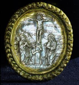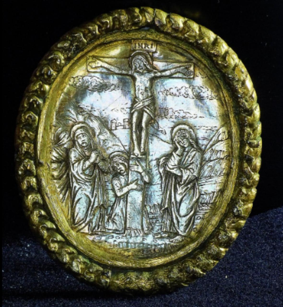 Personaggi: Cristo, Madonna, Maddalena, Giovanni apostolo. Abiti: (Cristo) perizoma; (Madonna) tunica e mantello; (Maddalena) tunica; (Giovanni evangelista) tunica e mantello. Paesaggio: rocce e terreno roccioso, montagne e città. Oggetti: croce. Fregi: cornice con teoria di fogliette. Materiali: argento dorato a fuoco e inciso a bulino.