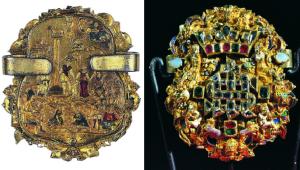 Fregi e incisioni: trigramma del nome di Gesù, Padre Eterno, figura maschile e femminile, putti, corona, figure di cavalli. Materiali: oro, parzialmente smaltato, diamanti, rubini, opali, perle. Retro: incisione con episodio dell'Adorazione del vitello d'oro con Mosè che spezza le tavole della legge.