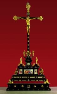 Personaggi: Gesù crocifisso, Madonna, Giovanni apostolo. Fregi: basamento modanato, leoni, statuine di profeti e Maria con Giovanni, cartelle con episodi evangelici dipinti, stemma di Clemente VIII, teste di cherubini e estremità della croce con Padre Eterno. Materiali: ebano, argento, rame.