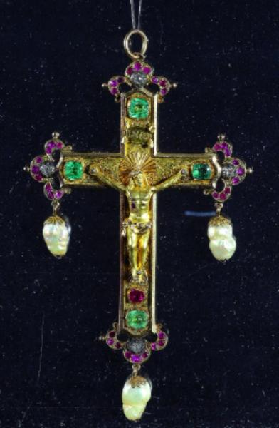 Fregi e particolari: elementi trilobati alle estremità dei bracci, Cristo morto con aureola, rubini e diamanti incastonati, perle pendenti, motivi vegetali incisi nei bracci della croce e simboli della passione ("Arma Christi"). Iscrizioni: "I.N.R.I.". Materiali: oro, argento dorato, gemme, perle.