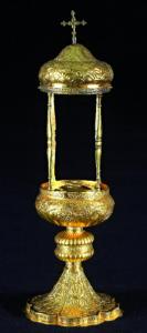 Fregi e incisioni: base esalobata, specchiature a motivi vegetali con medaglie e candelabre, nodo a doppia valva baccellata con fascia centrale, coppa con cherubini e festoni, bordo a fregio vegetale, colonne a balaustro, calotta a squamette e foglie, crocetta apicale a foglie.