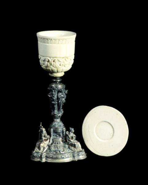 Fregi e incisioni: calice con piede mistilineo, gradino sagomato, festoni vegetali, figure a tutto tondo con le tre virtù teologali, specchiature con margini fitomorfi con iscrizioni cristologiche e simboli della passione, nodo formato da figure angeliche o cariatidi, coppa in avorio decorata nel sottocoppa a riccioli e nel 'labbro' a fogliette lanceolate.