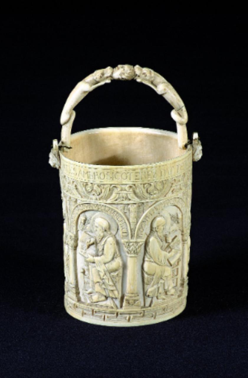 Fregi e incisioni: base a sezione circolare, superficie scandita da arcatelle racchiudenti le figure degli evangelisti e della Madonna con il Bambino, fascia alta decorata a foglie e rami, bordo alto con scritta incisa. Iscrizioni: nel bordo superiore "VATESAMBROSIGOTERExDATTEISGE VAS VENIENIESACPASARGENDUCESAREL+PIH".