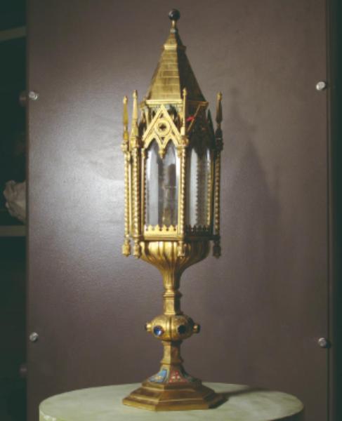 Fregi e incisioni: piede esagonale con decorazioni a micro mosaici floreali, nodo con gemme, sotto teca modanato, teca esagonale racchiusa da colonne tortili che sostengono cuspidi, guglia a lastre con globo apicale.