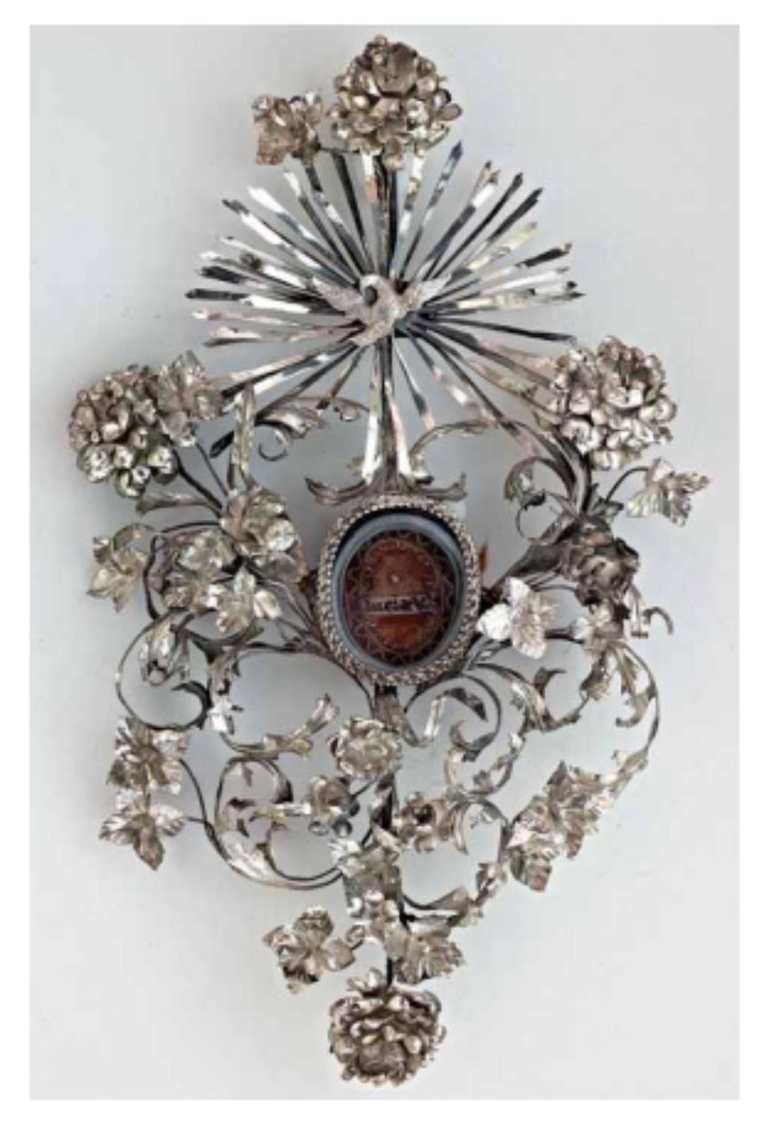 Fregi e incisioni: cornice modanata a rami arricciati con fiori e foglie, raggiera con colomba dello Spirito Santo. Iscrizioni: «S. Lucia V. M.».
