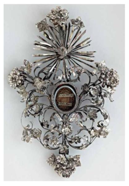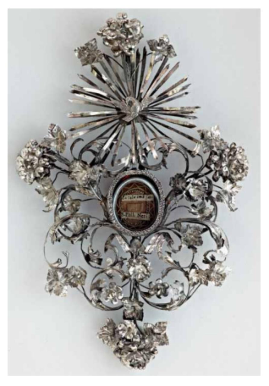 Fregi e incisioni: cornice modanata a rami arricciati con fiori e foglie, raggiera con colomba dello Spirito Santo. Iscrizioni: «Ex Tela imo san / S. Phil. Neri».
