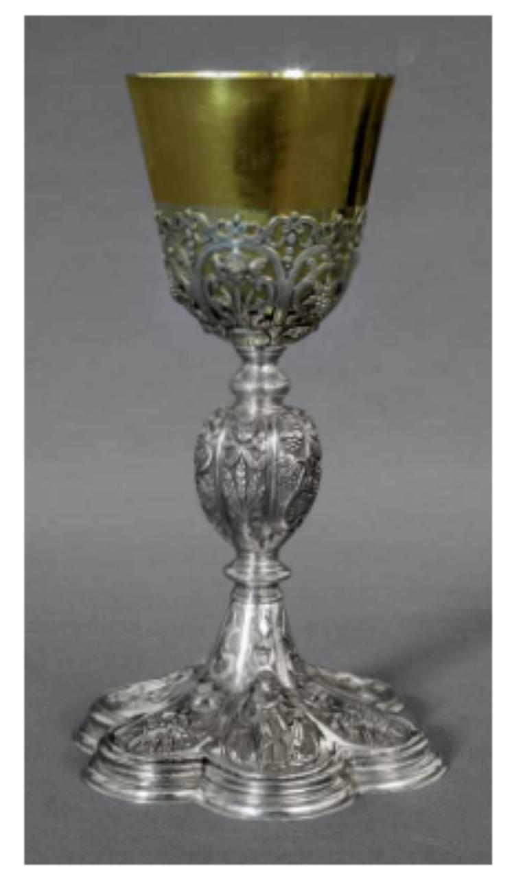 Fregi e incisioni: piede esalobato e a volute con cherubini che sorreggono un festone con un trionfo di tre grappoli d’uva su pampini con quattro spighe di grano, a cui si alternano: S. Giovanni Evangelista con calice avvelenato, S. Giovanni Battista e S. Caterina d’Alessandria; fusto c on nodo principale ovaliforme con cherubini e spighe, sottocoppa modanato con elementi fitomorfi e cherubini.