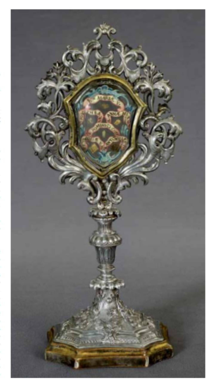 Fregi e incisioni: base lignea dorata a sezione ottagonale coi lati inflessi e modanati, piede con orlo piatto modanato, fusto a foglie e baccelli e nodo a vaso, teca mistilinea, con cornice liscia modanata circondata da fregio a giorno, declinato in un intreccio di palme, foglie d’acanto e lambrecchini. Iscrizioni sulle cedule: al recto «B.Æ MARIÆ V. / S. JOSEPH S. B. M. V. / S. ANNÆ M. B. M. / S. DOMINICI CONF. / S. EUROSIÆ V. M. / S. ANTONII PATAV.»; al verso «EX INDUSIO / EX OSSIBUS / EX PALLIO / EX OSSIBUS / EX HABITU / EX VELLO ASPERSO [CINE]».