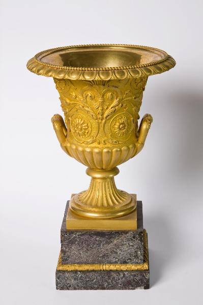 Coppa ansata dotata di basamento in marmo, associata ad un altra coppa identica