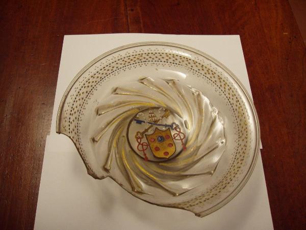 fruttiera con dipinto al centro lo stemma, parzialmente rovinata
