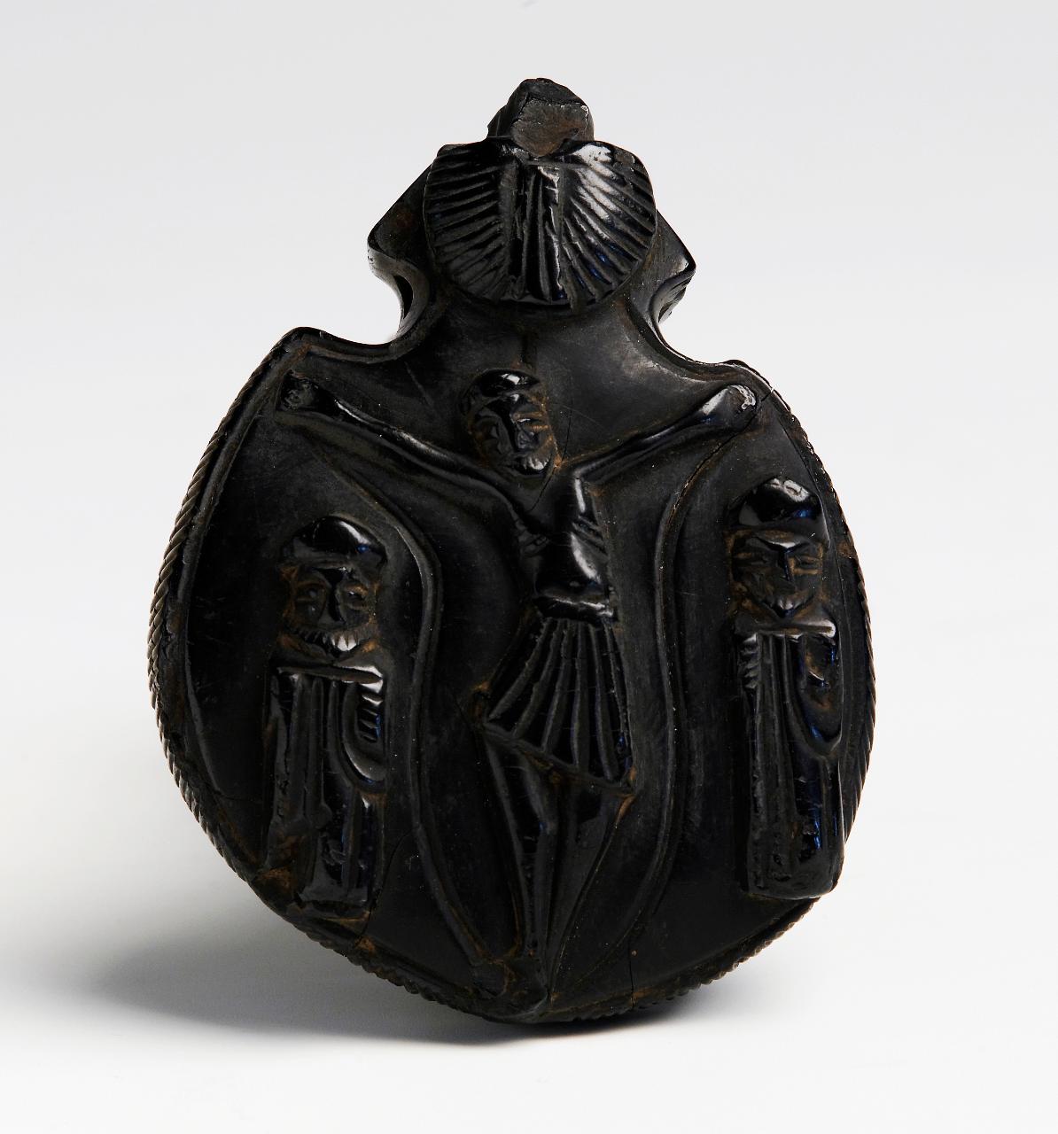 Medaglione a forma di conchiglia con Crocifisso e due santi vescovi. Crocifisso e due santi vescovi