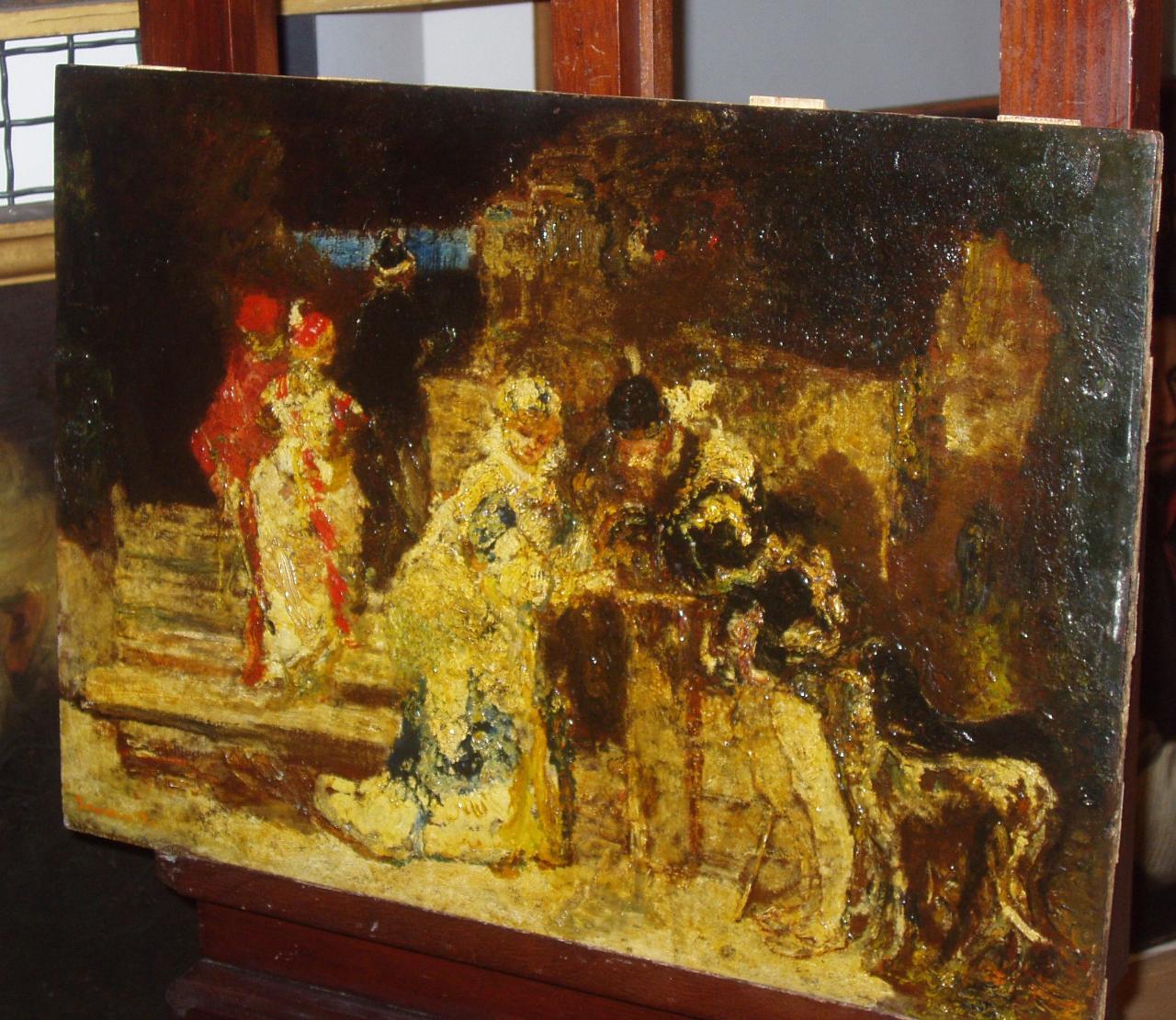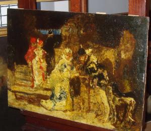 Le rendez vous. Groupe femme en blanc-bleu et homme trois figures au fond. Le rendez vous. Groupe femme en blanc-bleu et homme trois figures au fond