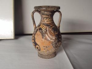 Pelike con labbro svasato, orlo arrotondato, collo cilindrico, spalla arrotondata, corpo globoso, alto piede e due anse a nastro