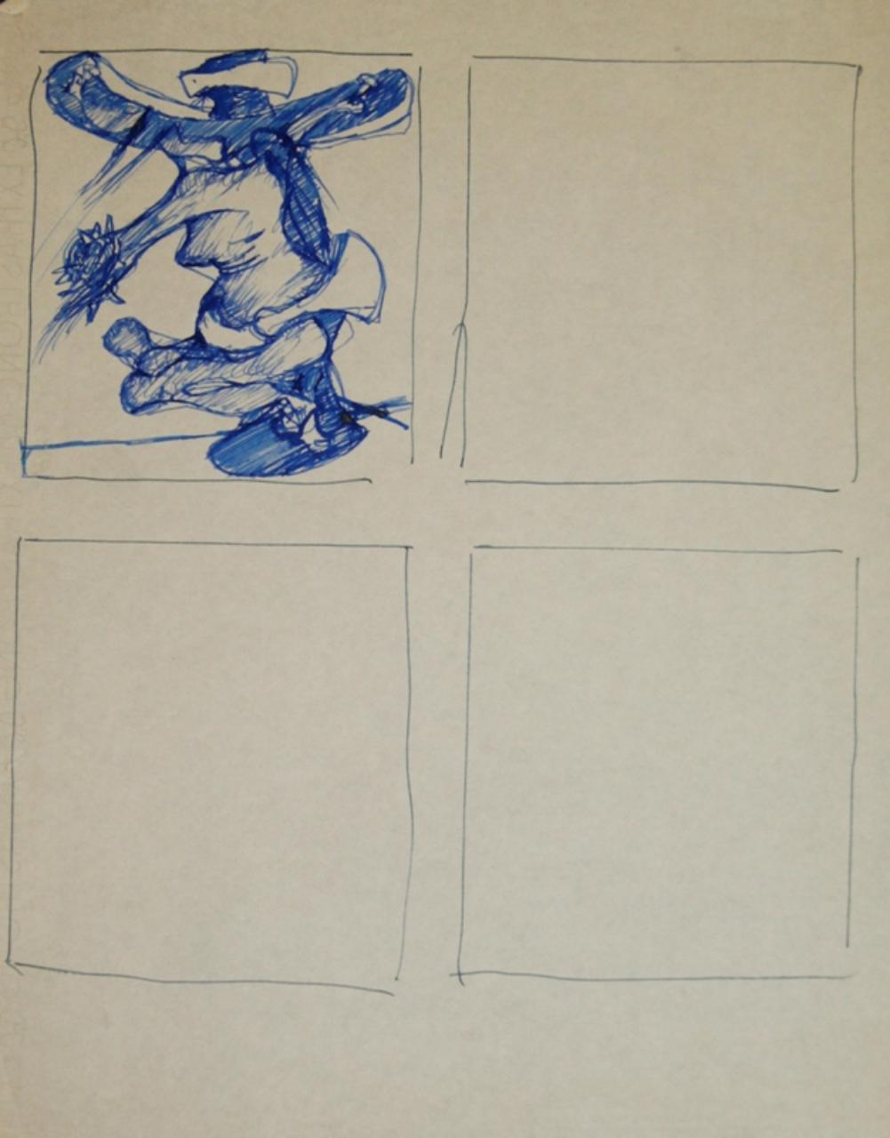 Il disegno è chiaramente legato alla serie di crocifissioni a tempera e pastello grasso realizzate nello stesso anno: possiede le medesime caratteristiche stilistiche pur non coincidendo con nessuna di esse. Potrebbe riferirsi ad una prova di impaginazione di quattro opere o al progetto per un allestimento.