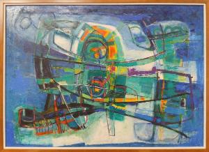 Composizione espressionistica e post-cubista su fondo blu nei toni del verde, rosso, giallo, bianco e nero.