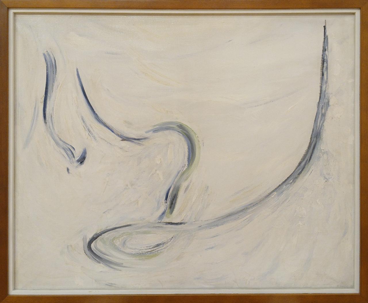 Composizione astratto-segnica dalla superficie materica sui toni del grigio chiaro, con segni serpeggianti costituiti da pennellate più scure.