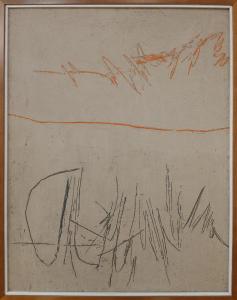 Composizione astratta costituita da una superficie granulosa e materica ottenuta con pomice, polvere di marmo e gesso, graffiata da una linea irregolare orizzontale e da due serie di segni gestualmente caotici quasi calligrafici. I segni rivelano una materia cromatica sottostante, arancio-rossa nella parte superiore e nera nella parte inferiore.