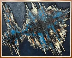 Composizione astratta con soluzioni di derivazione informale. Su fondo blu scuro una serie di campiture blu, arancio e bianche si allineano su una bisettrice obliqua, diventando più sottili e chiare all'estremità.