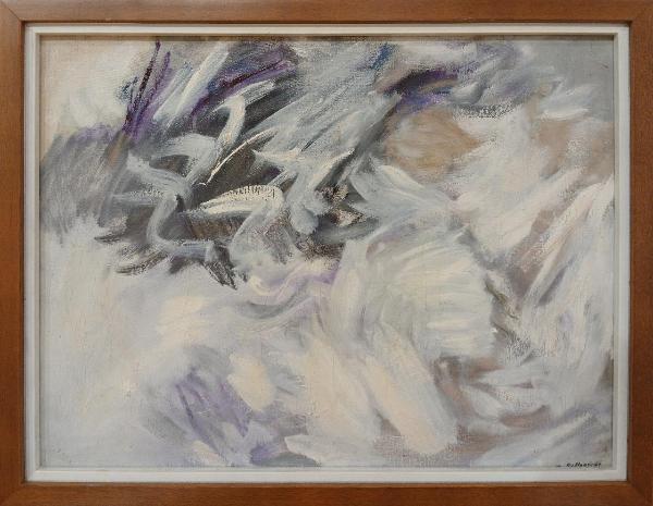 Composizione astratta con pennellate prevalentemente bianche e alcune campiture porpora, ocra e verde scuro, caratterizzata da una gestualità vorticosa e lirica quasi vicina all'automatismo surrealista.